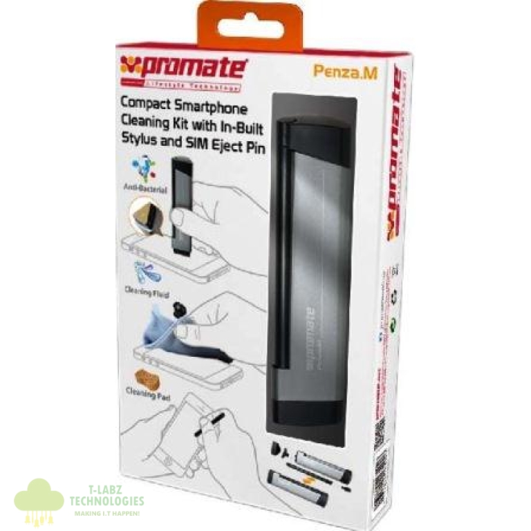 R156.69 incl VATPromate Penza.M Compact Smartphone Cleaning Kit with In-Built Stylus and SIM Eject Pin,auto-drip pad which releases just the right amount of cleaning liquid and a pin to eject SIM card from your iPhone,all fitted in one portable compact case The Penza.M is a specially designed cleaning gadget for smartphones. Comes with multiple features such as conductive pocket stylus, in-built auto-drip cleaning pad and SIM card eject pin – all fitted in one portable compact case. Stylus to be used on any touchscreen mobile devices, auto-drip pad which releases just the right amount of cleaning liquid and a pin to eject SIM card from your iPhone. An additional micro-fiber cleaning pouch completes this kit which could also be used for storage., Retail Box , 1 Year Warranty